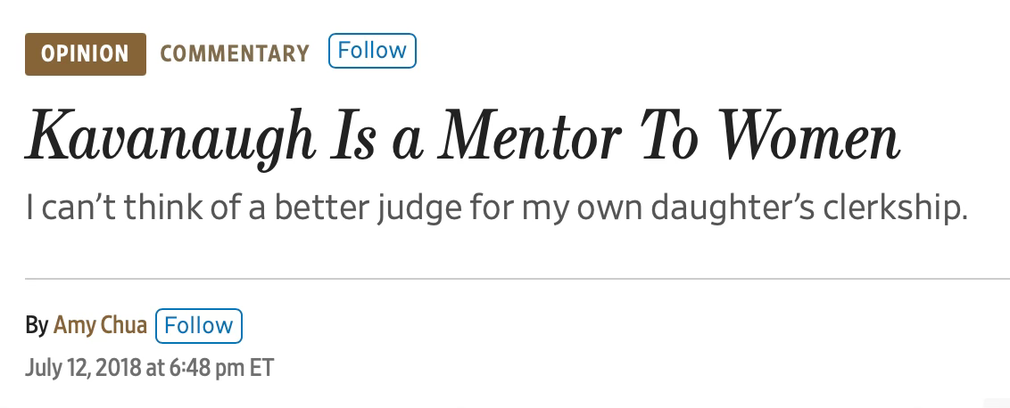 Chua, a professor with better PR instincts than judgement, was known for funneling students to Brett Kavanaugh for clerkships when he served as a circuit court judge — and for telling women applying for Kavanaugh clerkships that “it was ‘not an accident’ that Kavanaugh’s female law clerks all ‘looked like models.’” Chua didn’t intend that as a warning — it was advice. According to The Guardian, Chua “was known for instructing female law students who were preparing for interviews with Kavanaugh on ways they could dress to exude a ‘model-like’ femininity to help them win a post in Kavanaugh’s chambers.” When Donald Trump nominated Kavanaugh for a seat on the Supreme Court, Chua endorsed Kavanaugh as a “mentor to women.”