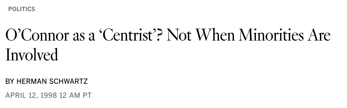 No affiliation? Not an activist or advocate? In fact, O’Connor had worked on Barry Goldwater’s hard-right presidential campaign and served in the Arizona state Senate, where her fellow Republicans chose her to lead them.