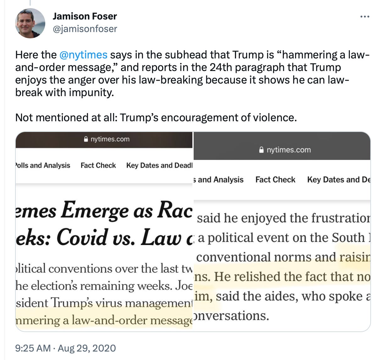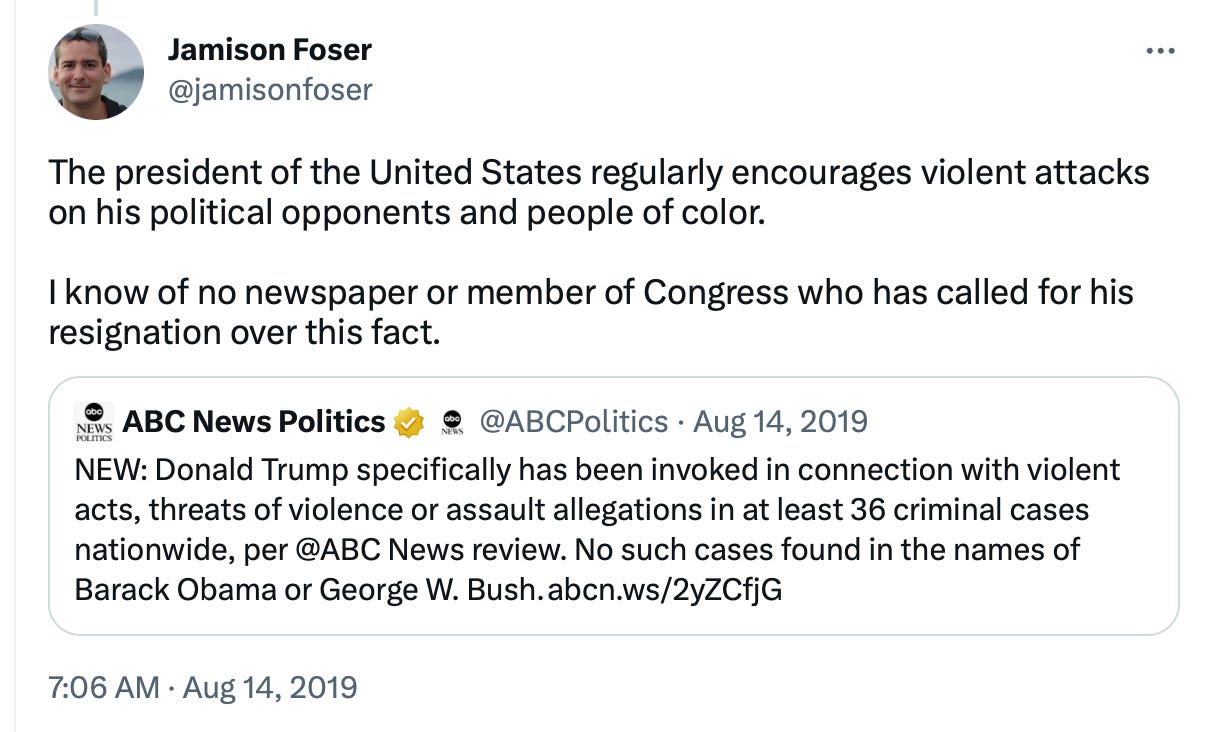 And yet, for the most part, America’s leading news companies ignored or downplayed the sitting president of the United States inciting violence against his political adversaries. Sure, individual comments were covered — though often much less prominently than they should have been, and they were met with far too little disapproval:1