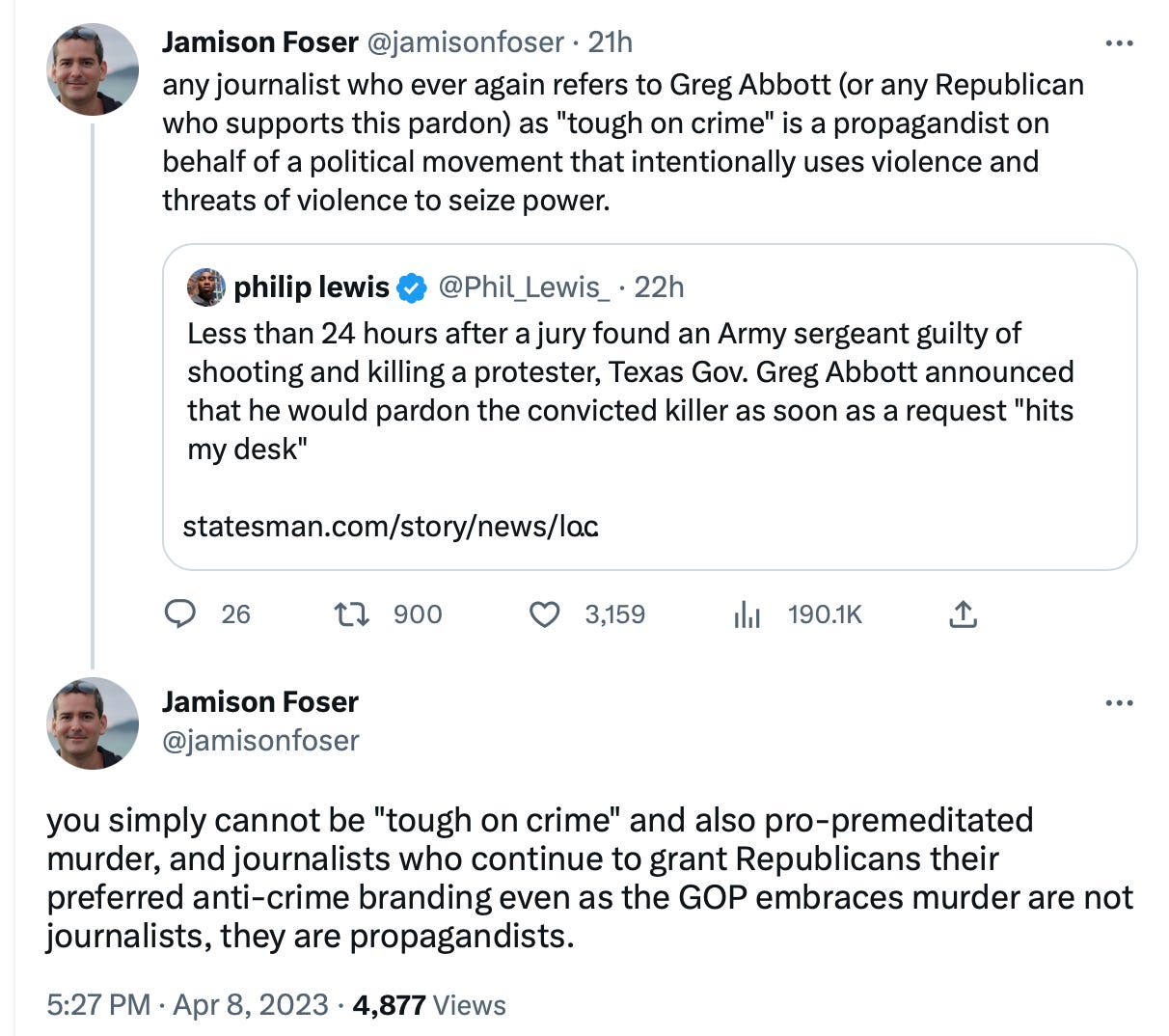 Donald Trump, Greg Abbott, and countless other prominent Republicans have embraced and incited political violence. And they celebrate and defend a man who was convicted of murder for shooting a protester four times after declaring his intention to kill protesters. It is simply obscene to help them portray themselves as “tough on crime” and portray progressives as weak on public safety — and it is not journalism.